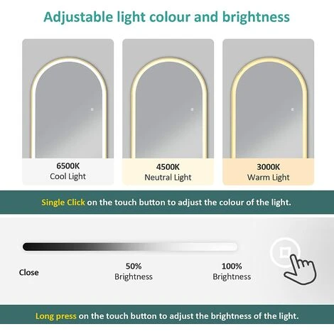 3 lighting colors: cold light 6500K, warm light 3000K, neutral light 4000K. Click on the touch switch of the full length mirror.