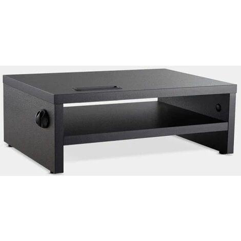 In sleek black wood, the stand has plenty of space and storage to help maximise desk-space and put an end to clutter. With a dedicated phone holder and cable management system, you can keep your gadgets and wires neat and charged up. Use the shelf to hold important documents, notepads or keyboard to keep your work space clear.
